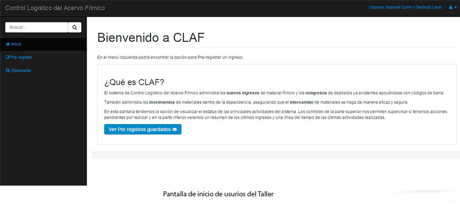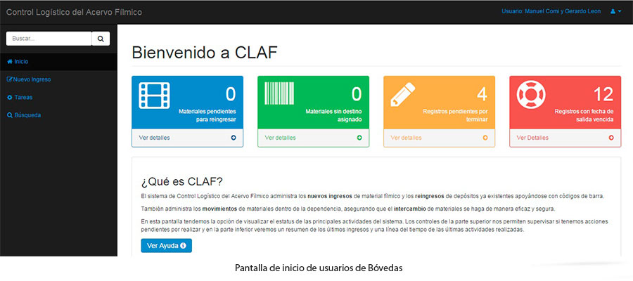 El sistema de Control Logístico del Acervo Fílmico administra los nuevos ingresos de material fílmico y los reingresos de depósitos ya existentes apoyándose con códigos de barra. Este proceso se lleva a cabo con el apoyo del Taller de Rescate y Restauración, área que se encarga de hacer un pre registro de la procedencia de los materiales, los títulos que ingresarán y las características físicas de las copias. Posteriormente al área de Bóvedas se encarga de imprimir, pegar y relacionar códigos de barra a cada contenedor para ingresarse a bóvedas. Para este último proceso el área de Bóvedas se apoya en un dispositivo móvil dotado de una interfaz para relacionar cada contenedor con ubicaciones previamente registradas con código de barras.