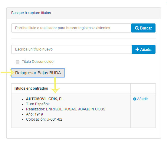 - Buscando el título del material a ingresar en el catálogo de títulos de la base de datos. Éste catálogo se alimenta de todos los nuevos títulos que se agregan en cada registro realizado. Esta opción cuenta con una búqueda dinámica, es decir que cada vez que tecleamos una letra se mostrará una lista con los títulos existentes. Además del título se admite la busqueda por realizador. Vemos un ejemplo en la siguiente figura.