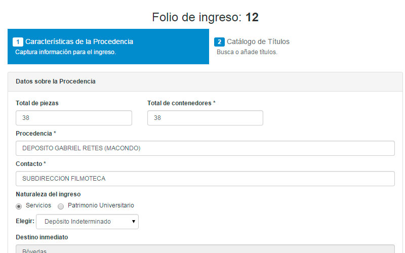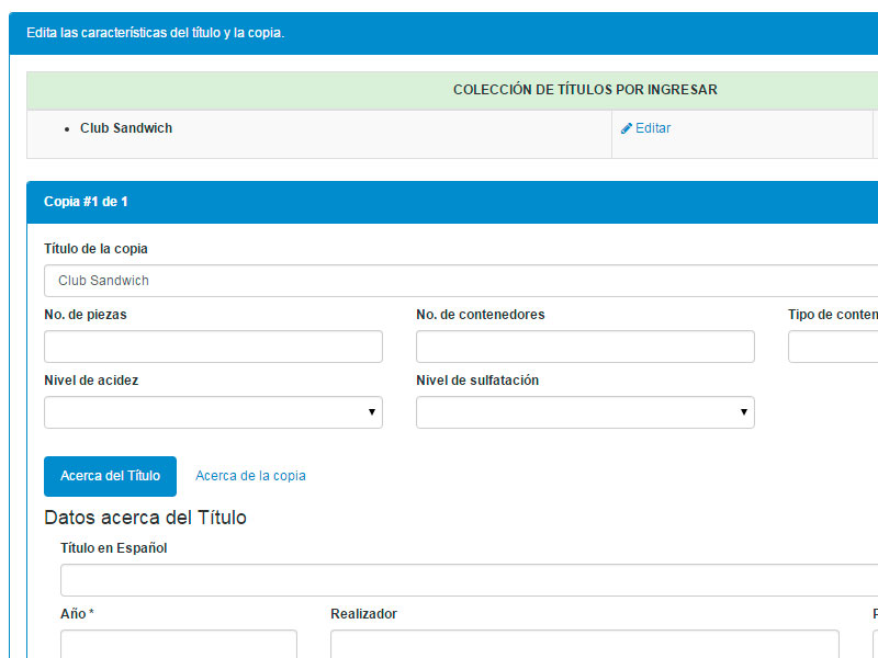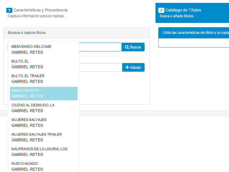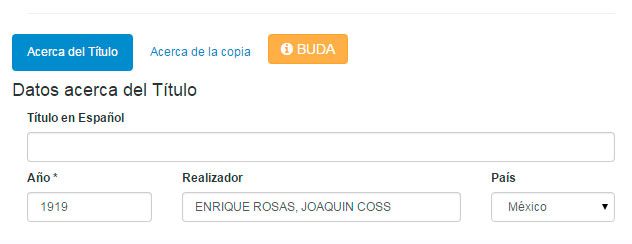 Es importante que tengamos cuidado con la captura en este punto con la finalidad de mantener un catálogo lo más limpio posible, el sistema registra un título único comparando con el año de producción. Es decir, si tenemos un "Titulo Uno" que se produjo en el año 2000 y en otro registro capturamos "Titulo 1" con año 2000, estaremos creando dos títulos diferentes que se refieren al mismo. Esto generaría que la información pierda su integridad. Es IMPORTANTE que siempre se consulte el catálogo para verificar si el título que queremos ingresar YA EXISTE.