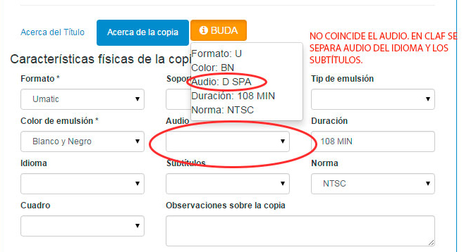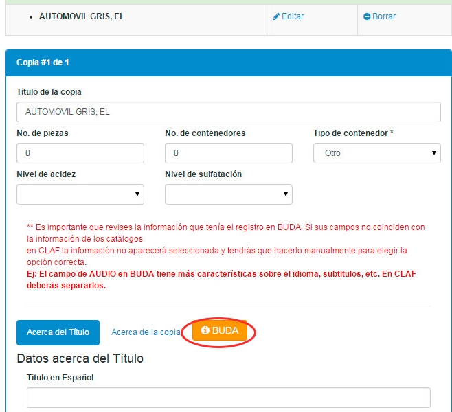 - Agregando títulos de registros que se dieron de baja en BUDA. Está opción permitirá que sea más rápida la captura de un registro que se ha dado de baja en BUDA para reingresar por CLAF. El formulario se completará automáticamente con la información del título y las características de la copia que coincidan con los campos del formulario. Esto no quiere decir que la información sea correcta, se tendrá que revisar porque habrán casos en que se tendrá que editar directamente algún campo que no coincida. Por ejemplo en el caso de que tuvieramos en BUDA un material de 35 mm, el texto de captura podría traer algún error como espacios o letras de más por errores de captura (35mm, 35 mmm, 35m). Para evitar estos errores CLAF sólo admite valores dentro de un catálogo dependiendo del campo, por lo que errores cómo los ejemplos no se podrán capturar automáticamente en los formularios y tendremos que marcarlo. Para este caso en particular tendremos una ayuda, un botón que nos permitirá ver la información que contenía esta copia en BUDA para que en caso de no visualizar la captura automática podamos elegir la opción correcta. Las siguientes figuras nos muestra un ejemplo.