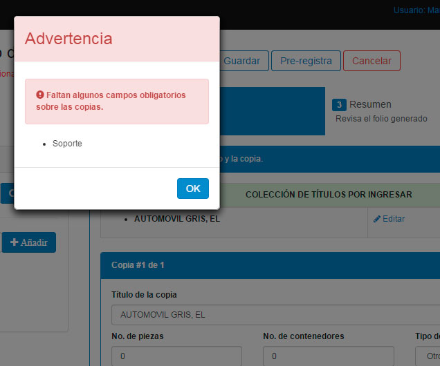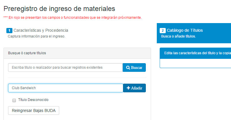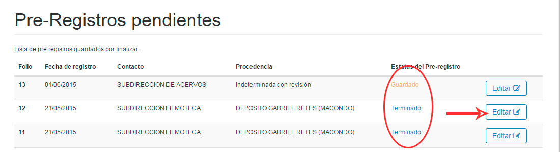 - Editar un pre registro guardado. Esto permite que la captura pueda hacerse en diferentes sesiones, existe la posibilidad de que tengamos registros con muchos títulos y podemos guardar nuestro avance para continuar en otro momento, tal vez para ir revisando materiales y capturar su información hasta terminar con el total de materiales.