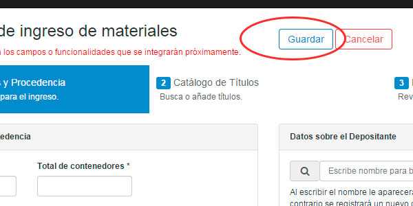 El paso número 1 consiste en completar el formulario con datos referentes a la Procedencia de los materiales, además de los datos del depositante o propietario de los materiales. En caso de requerirlo, el depositante puede designar hasta un máximo de 3 personas que pueden tener acceso a los materiales relacionados con el ingreso.