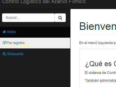 Una vez que un usuario ingresa será redireccionado a su página principal. Para este caso verán que la pantalla principal sólo tiene dos opciones: Pre registro y Búsqueda. Además tenemos un enlace para poder acceder a la lista de pre registros guardados para poder editar posteriormente a su registro.