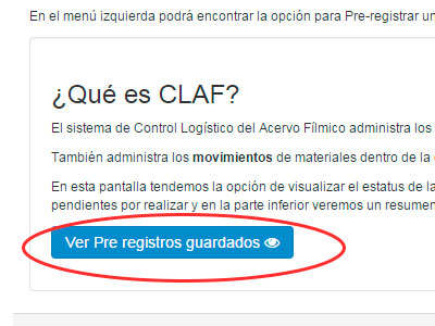 Esta sección es para los usuarios que tienen únicamente el privilegio para realizar pre registros. En esta primera etapa el grupo encargado de llevar a cabo el pre registro es el Taller de Rescate y Restauración.